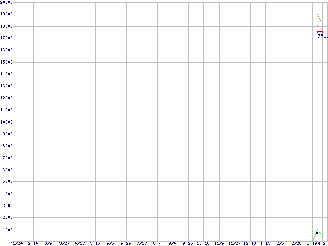 ※このグラフは過去のデータも税率5%相当に調整した税込み相当額のグラフです。 税率変更や、総額表示方式導入(2004年4月)の影響は除いています。 | | | ●凡例 | 最安値 (点線部は販売店未確認 または未調査) | 平均値 | 最高値 | ショップ数 |