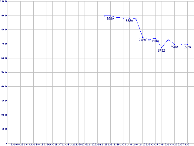 | Socket AM2 (HyperTransport,Dual Core,L3 2MB,TDP 95W)の最安値推移 | | | (2008年9月19日~2009年4月3日) |