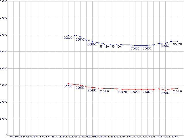 | LGA1366 (QPI 4.8GT/s,L3キャッシュ8MB,Quad Core,Hyper-Threading)の最安値推移 | | | (2008年9月19日~2009年4月3日) |
