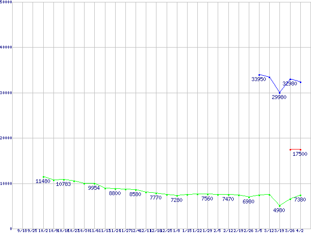 WD Caviar Blue (7200rpm,3Gb/s,16MB)の最安値推移