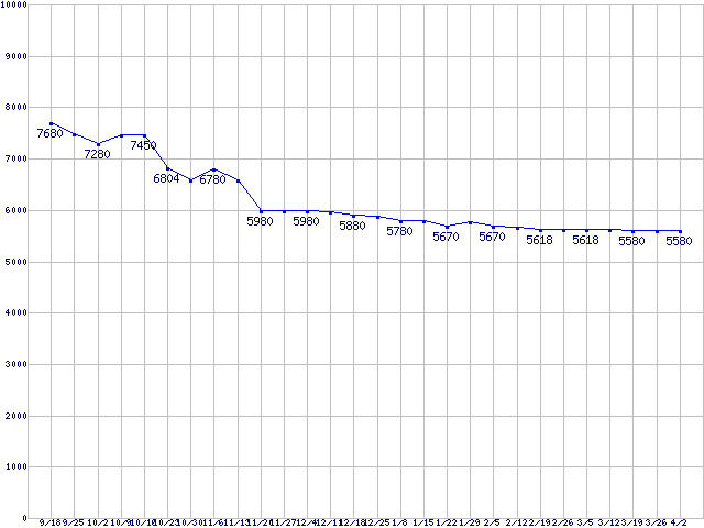 WD Caviar Blue (7200rpm,3Gb/s,16MB)の最安値推移
