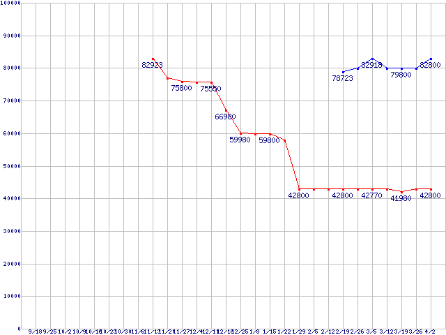 | X25-E Extreme SATA SSD (SSD,3Gb/s,2.5インチ,リード250MB/s・ライト170MB/s)の最安値推移 | | | (2008年9月18日~2009年4月2日) |
