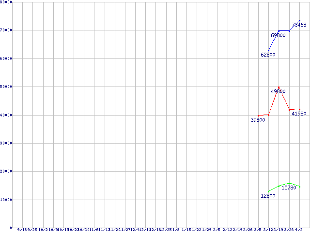 | OCZ Vertex Series SATA II 2.5" SSD (SSD,3Gb/s,2.5インチ,リード250~230MB/s・ライト180~135MB/s)の最安値推移 | | | (2008年9月18日~2009年4月2日) |