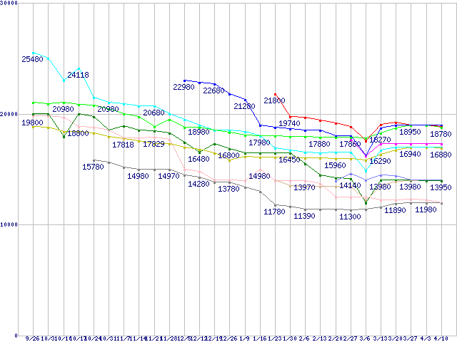 | CPU主要製品(最安値1万円~2万円未満)の最安値推移 | | | (2008年9月26日~2009年4月10日) |