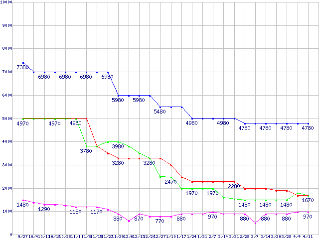 メモリ主要製品(最安値5千円未満)の最安値推移