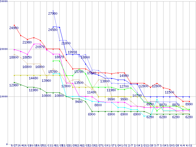 メモリ主要製品(最安値1万円以上)の最安値推移