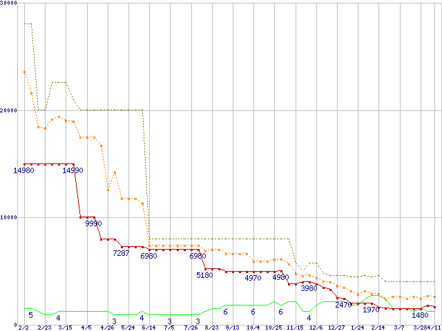 ※このグラフは過去のデータも税率5%相当に調整した税込み相当額のグラフです。 税率変更や、総額表示方式導入(2004年4月)の影響は除いています。 | | | ●凡例 | 最安値 (点線部は販売店未確認 または未調査) | 平均値 | 最高値 | ショップ数 |