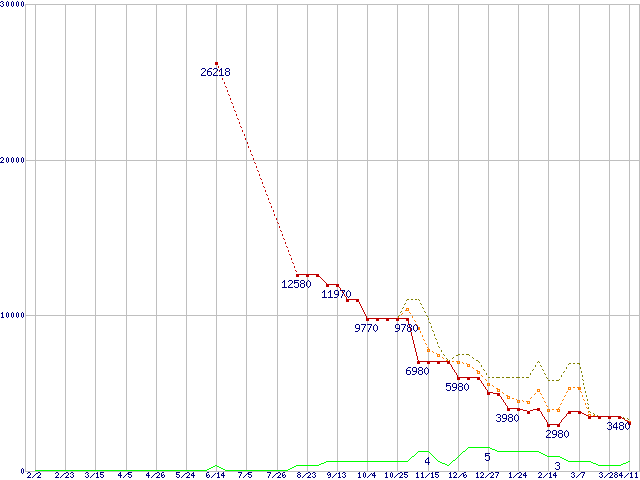 ※このグラフは過去のデータも税率5%相当に調整した税込み相当額のグラフです。 税率変更や、総額表示方式導入(2004年4月)の影響は除いています。 | | | ●凡例 | 最安値 (点線部は販売店未確認 または未調査) | 平均値 | 最高値 | ショップ数 |