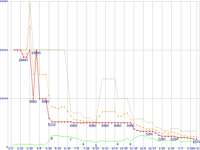 ※このグラフは過去のデータも税率5%相当に調整した税込み相当額のグラフです。 税率変更や、総額表示方式導入(2004年4月)の影響は除いています。 | | | ●凡例 | 最安値 (点線部は販売店未確認 または未調査) | 平均値 | 最高値 | ショップ数 |