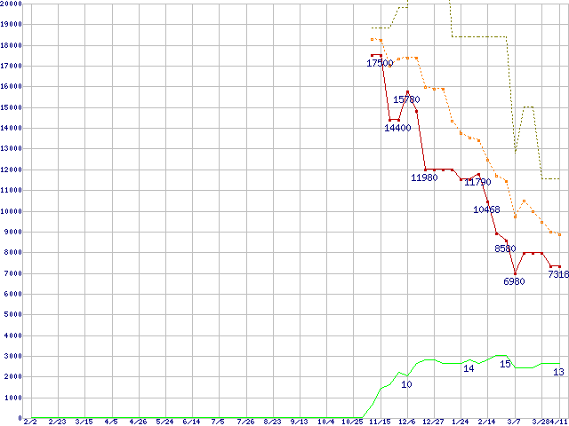 ※このグラフは過去のデータも税率5%相当に調整した税込み相当額のグラフです。 税率変更や、総額表示方式導入(2004年4月)の影響は除いています。 | | | ●凡例 | 最安値 (点線部は販売店未確認 または未調査) | 平均値 | 最高値 | ショップ数 |