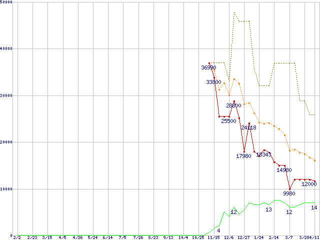※このグラフは過去のデータも税率5%相当に調整した税込み相当額のグラフです。 税率変更や、総額表示方式導入(2004年4月)の影響は除いています。 | | | ●凡例 | 最安値 (点線部は販売店未確認 または未調査) | 平均値 | 最高値 | ショップ数 |