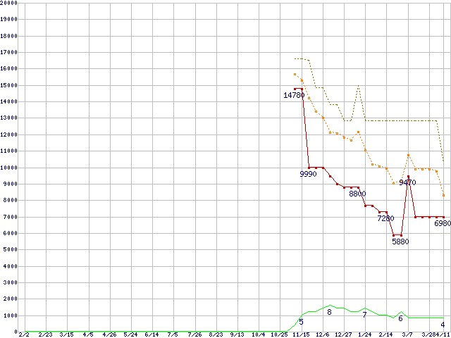 ※このグラフは過去のデータも税率5%相当に調整した税込み相当額のグラフです。 税率変更や、総額表示方式導入(2004年4月)の影響は除いています。 | | | ●凡例 | 最安値 (点線部は販売店未確認 または未調査) | 平均値 | 最高値 | ショップ数 |