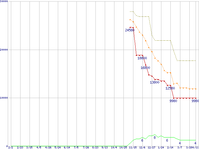 ※このグラフは過去のデータも税率5%相当に調整した税込み相当額のグラフです。 税率変更や、総額表示方式導入(2004年4月)の影響は除いています。 | | | ●凡例 | 最安値 (点線部は販売店未確認 または未調査) | 平均値 | 最高値 | ショップ数 |