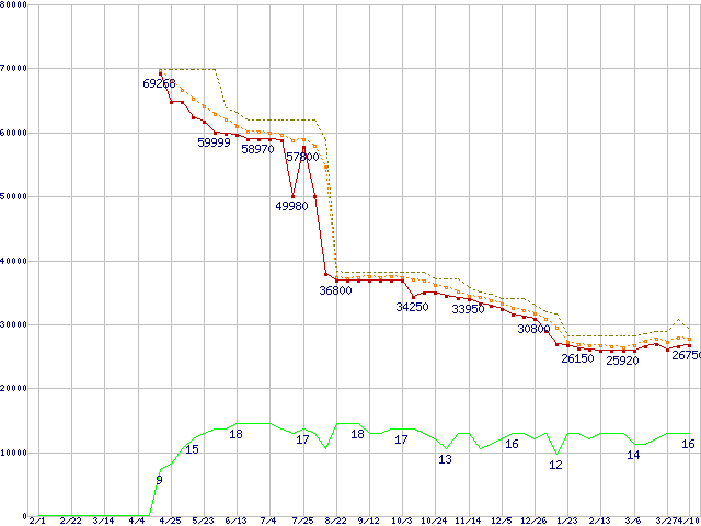 ※このグラフは過去のデータも税率5%相当に調整した税込み相当額のグラフです。 税率変更や、総額表示方式導入(2004年4月)の影響は除いています。 | | | ●凡例 | 最安値 (点線部は販売店未確認 または未調査) | 平均値 | 最高値 | ショップ数 |