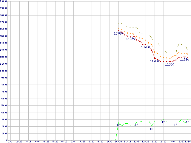 ※このグラフは過去のデータも税率5%相当に調整した税込み相当額のグラフです。 税率変更や、総額表示方式導入(2004年4月)の影響は除いています。 | | | ●凡例 | 最安値 (点線部は販売店未確認 または未調査) | 平均値 | 最高値 | ショップ数 |