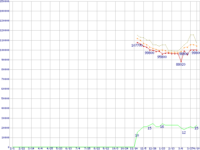 ※このグラフは過去のデータも税率5%相当に調整した税込み相当額のグラフです。 税率変更や、総額表示方式導入(2004年4月)の影響は除いています。 | | ●凡例 | 最安値 (点線部は販売店未確認 または未調査) | 平均値 | 最高値 | ショップ数 |