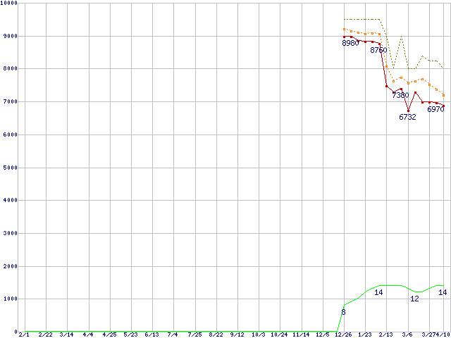 | Athlon X2 7750 Black Edition (2.7GHz,L2 512KB×2,L3 2MB)の価格推移 | | | (2008年2月1日~2009年4月10日) |