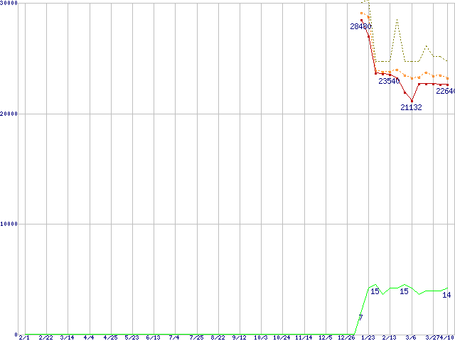 ※このグラフは過去のデータも税率5%相当に調整した税込み相当額のグラフです。 税率変更や、総額表示方式導入(2004年4月)の影響は除いています。 | | | ●凡例 | 最安値 (点線部は販売店未確認 または未調査) | 平均値 | 最高値 | ショップ数 |
