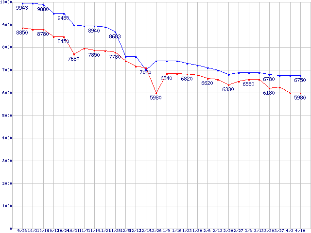 | Socket AM2 (HyperTransport,Dual Core,TDP 65W)の最安値推移 | | | (2008年9月26日~2009年4月10日) |