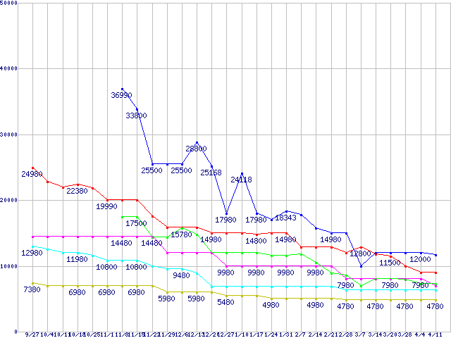 PC2-6400(DDR2-800) DDR2 SDRAM DIMMの最安値推移