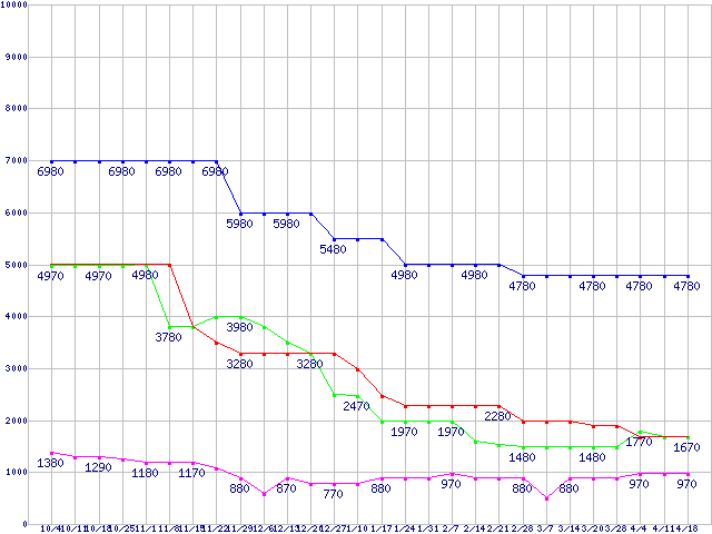 メモリ主要製品(最安値5千円未満)の最安値推移