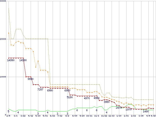 ※このグラフは過去のデータも税率5%相当に調整した税込み相当額のグラフです。 税率変更や、総額表示方式導入(2004年4月)の影響は除いています。 | | | ●凡例 | 最安値 (点線部は販売店未確認 または未調査) | 平均値 | 最高値 | ショップ数 |