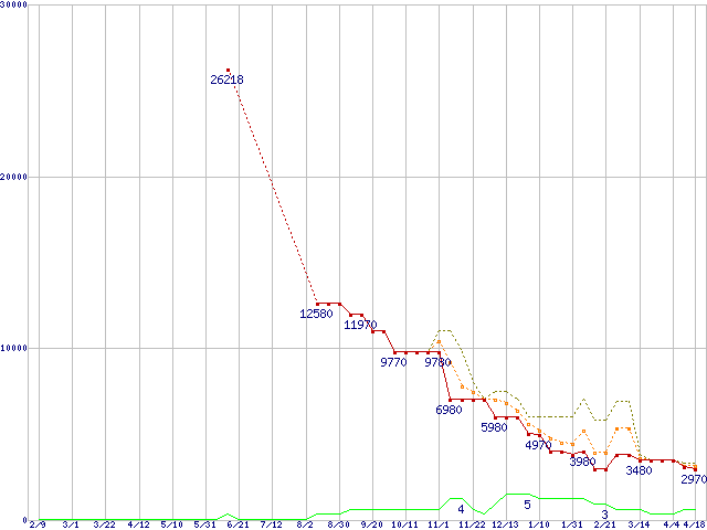 ※このグラフは過去のデータも税率5%相当に調整した税込み相当額のグラフです。 税率変更や、総額表示方式導入(2004年4月)の影響は除いています。 | | | ●凡例 | 最安値 (点線部は販売店未確認 または未調査) | 平均値 | 最高値 | ショップ数 |