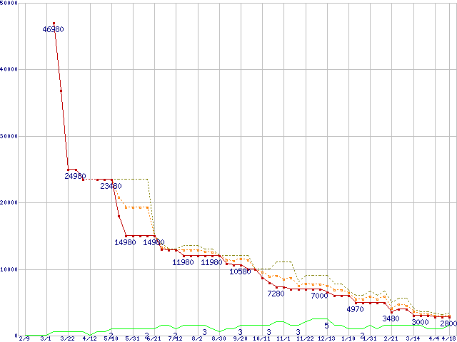 ※このグラフは過去のデータも税率5%相当に調整した税込み相当額のグラフです。 税率変更や、総額表示方式導入(2004年4月)の影響は除いています。 | | | ●凡例 | 最安値 (点線部は販売店未確認 または未調査) | 平均値 | 最高値 | ショップ数 |