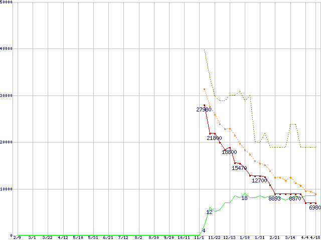 ※このグラフは過去のデータも税率5%相当に調整した税込み相当額のグラフです。 税率変更や、総額表示方式導入(2004年4月)の影響は除いています。 | | | ●凡例 | 最安値 (点線部は販売店未確認 または未調査) | 平均値 | 最高値 | ショップ数 |