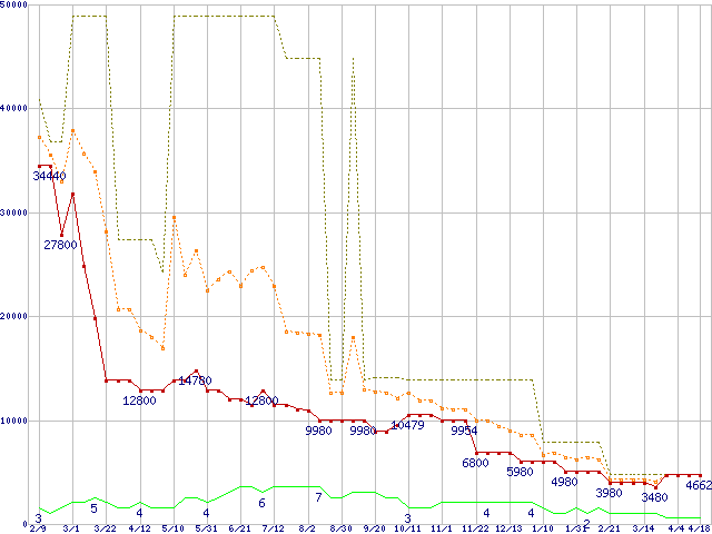 メモリ主要製品(最安値5千円未満)の最安値推移