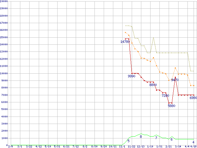 ※このグラフは過去のデータも税率5%相当に調整した税込み相当額のグラフです。 税率変更や、総額表示方式導入(2004年4月)の影響は除いています。 | | | ●凡例 | 最安値 (点線部は販売店未確認 または未調査) | 平均値 | 最高値 | ショップ数 |