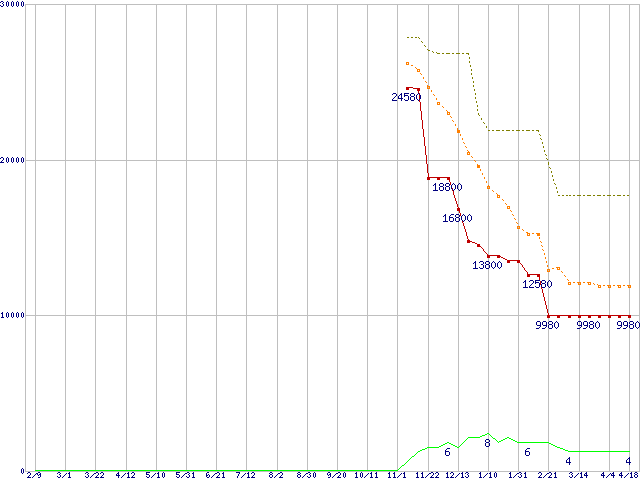 ※このグラフは過去のデータも税率5%相当に調整した税込み相当額のグラフです。 税率変更や、総額表示方式導入(2004年4月)の影響は除いています。 | | | ●凡例 | 最安値 (点線部は販売店未確認 または未調査) | 平均値 | 最高値 | ショップ数 |