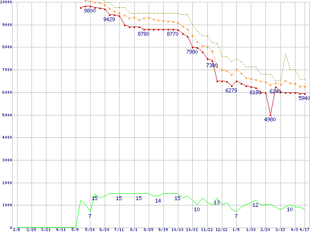 | Athlon X2 4850e (2.5GHz,L2 512KB×2)の価格推移 | | | (2008年2月8日~2009年4月17日) |