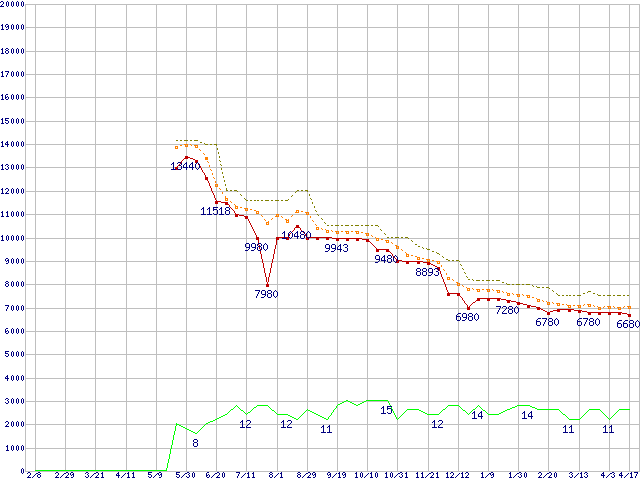 ※このグラフは過去のデータも税率5%相当に調整した税込み相当額のグラフです。 税率変更や、総額表示方式導入(2004年4月)の影響は除いています。 | | | ●凡例 | 最安値 (点線部は販売店未確認 または未調査) | 平均値 | 最高値 | ショップ数 |