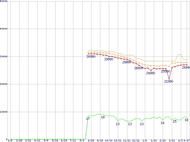 | Core 2 Duo E8600 (3.33GHz,L2 6MB)の価格推移 | | | (2008年2月8日~2009年4月17日) |