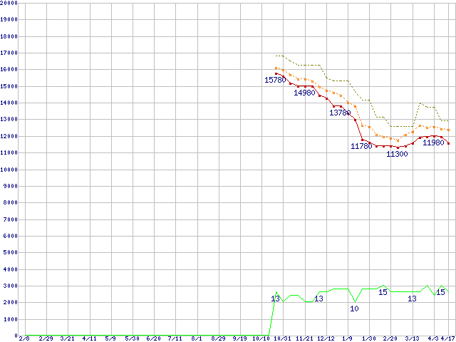 ※このグラフは過去のデータも税率5%相当に調整した税込み相当額のグラフです。 税率変更や、総額表示方式導入(2004年4月)の影響は除いています。 | | | ●凡例 | 最安値 (点線部は販売店未確認 または未調査) | 平均値 | 最高値 | ショップ数 |