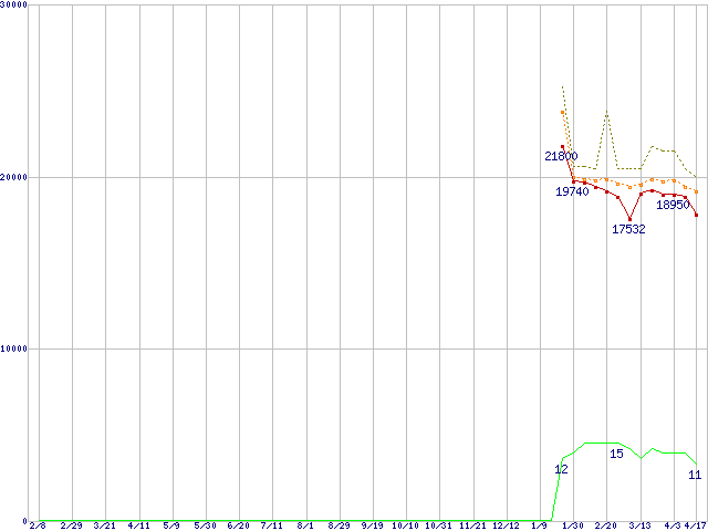 | Phenom II X4 920 (2.8GHz,L2 512KB×4,L3 6MB)の価格推移 | | | (2008年2月8日~2009年4月17日) |