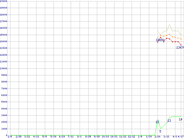 ※このグラフは過去のデータも税率5%相当に調整した税込み相当額のグラフです。 税率変更や、総額表示方式導入(2004年4月)の影響は除いています。 | | | ●凡例 | 最安値 (点線部は販売店未確認 または未調査) | 平均値 | 最高値 | ショップ数 |