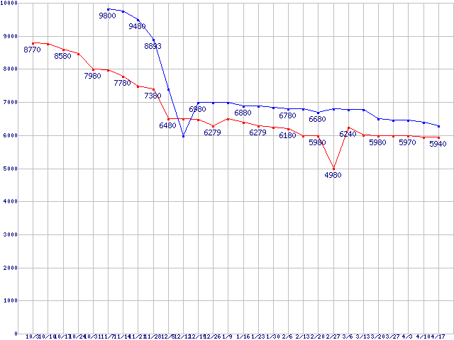 | Socket AM2 (HyperTransport,Dual Core,TDP 45W)の最安値推移 | | | (2008年10月3日~2009年4月17日) |