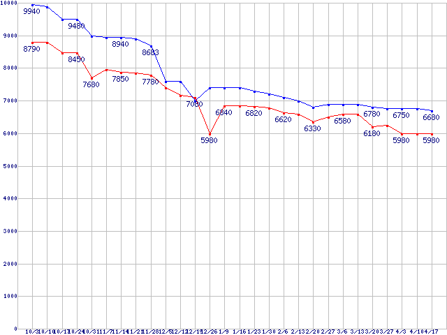 | Socket AM2 (HyperTransport,Dual Core,TDP 65W)の最安値推移 | | | (2008年10月3日~2009年4月17日) |