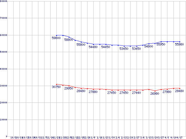 | LGA1366 (QPI 4.8GT/s,L3キャッシュ8MB,Quad Core,Hyper-Threading)の最安値推移 | | | (2008年10月3日~2009年4月17日) |