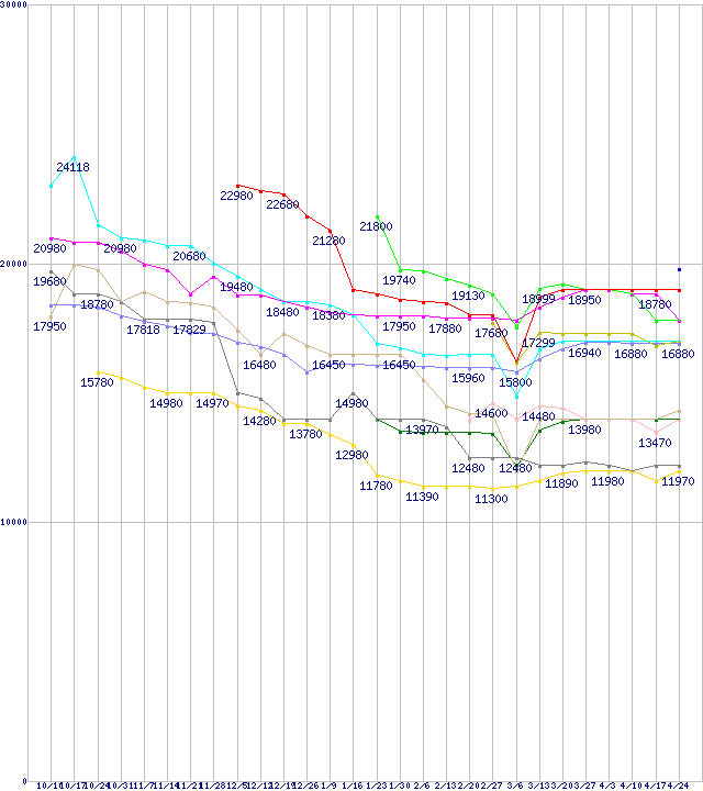 | CPU主要製品(最安値1万円~2万円未満)の最安値推移 | | | (2008年10月10日~2009年4月24日) |