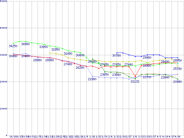 | CPU主要製品(最安値2万円~3万円未満)の最安値推移 | | | (2008年10月10日~2009年4月24日) |
