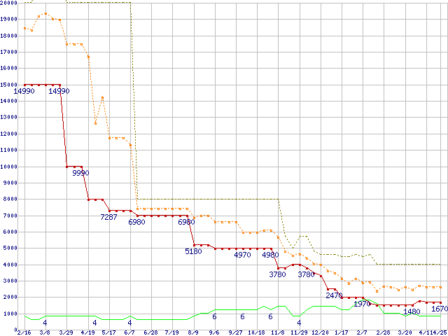 ※このグラフは過去のデータも税率5%相当に調整した税込み相当額のグラフです。 税率変更や、総額表示方式導入(2004年4月)の影響は除いています。 | | | ●凡例 | 最安値 (点線部は販売店未確認 または未調査) | 平均値 | 最高値 | ショップ数 |