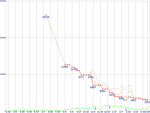 ※このグラフは過去のデータも税率5%相当に調整した税込み相当額のグラフです。 税率変更や、総額表示方式導入(2004年4月)の影響は除いています。 | | | ●凡例 | 最安値 (点線部は販売店未確認 または未調査) | 平均値 | 最高値 | ショップ数 |