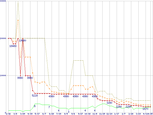 ※このグラフは過去のデータも税率5%相当に調整した税込み相当額のグラフです。 税率変更や、総額表示方式導入(2004年4月)の影響は除いています。 | | | ●凡例 | 最安値 (点線部は販売店未確認 または未調査) | 平均値 | 最高値 | ショップ数 |
