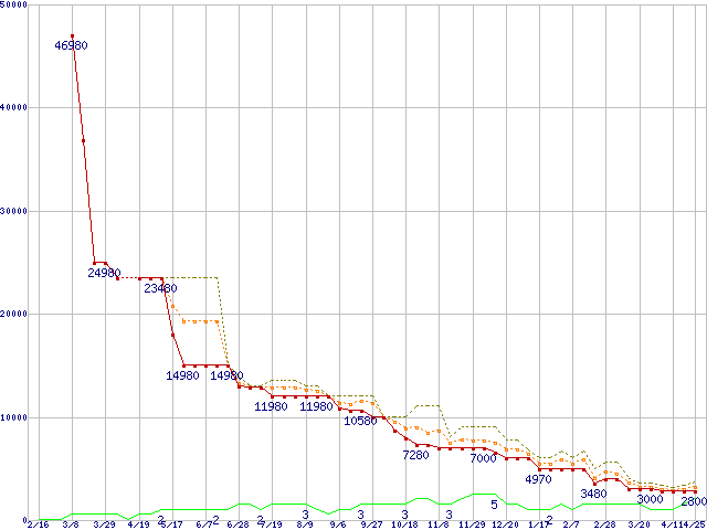 ※このグラフは過去のデータも税率5%相当に調整した税込み相当額のグラフです。 税率変更や、総額表示方式導入(2004年4月)の影響は除いています。 | | | ●凡例 | 最安値 (点線部は販売店未確認 または未調査) | 平均値 | 最高値 | ショップ数 |