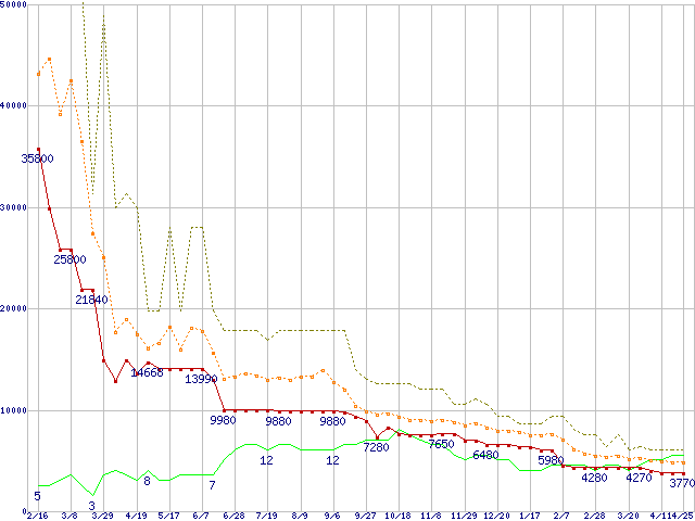 メモリ主要製品(最安値5千円未満)の最安値推移