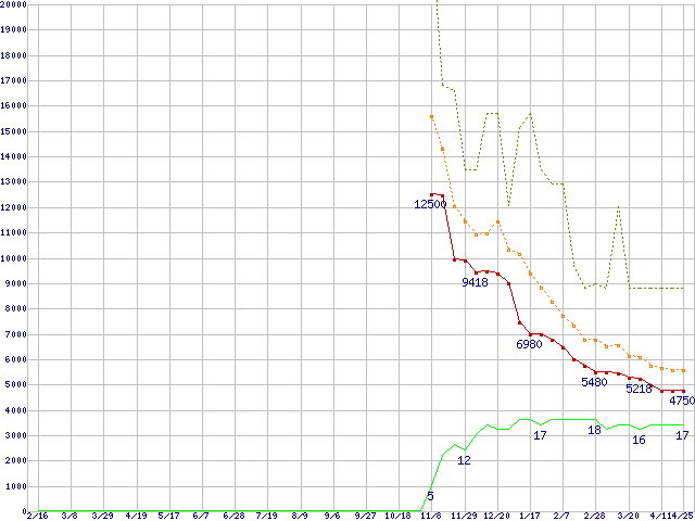 ※このグラフは過去のデータも税率5%相当に調整した税込み相当額のグラフです。 税率変更や、総額表示方式導入(2004年4月)の影響は除いています。 | | | ●凡例 | 最安値 (点線部は販売店未確認 または未調査) | 平均値 | 最高値 | ショップ数 |