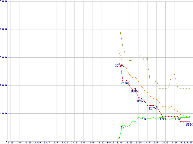 ※このグラフは過去のデータも税率5%相当に調整した税込み相当額のグラフです。 税率変更や、総額表示方式導入(2004年4月)の影響は除いています。 | | | ●凡例 | 最安値 (点線部は販売店未確認 または未調査) | 平均値 | 最高値 | ショップ数 |